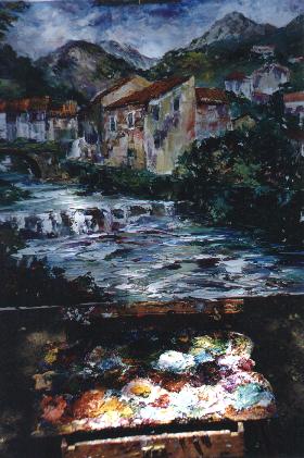 The oil painting is in the easel with a smorgasbord of oil spread over the palette below. It almost looks as if the whole thing is a painting. But it is not - it is our photos of the artist environment. |