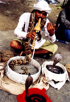 | The infamous snake charmers. Cobras and Pythons abound to entertain the tourists. There were many varied stories spoken about how the charmers actually charm their snakes. From the snakes are drugged, to they are fangless and poisonless, to the rythm of the flute making the snakes mesmorized and unabe to strike. In general it looked like the charmers new how to handle snakes and the snakes where used to the charmers - an entertainment team. | ![]() |