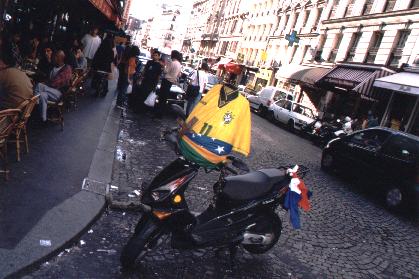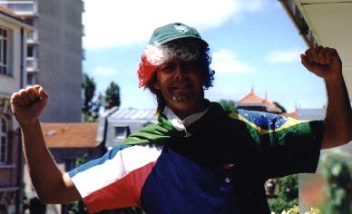 Hans had bought this shirt in Rio at the beginning of the year for $3. A French flag on the right arm and a Brazilian flag on the left arm (another foreshadow). At this time in Paris we could have sold it for $100, easy. But we decided to give it to Natalie at the end of the Cup. She had the most fun spunk and deserved it - especially after putting up with all our Brazilian ranting and raving. | ![]() |