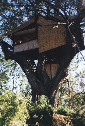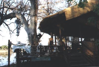 The main hut is where we had our meals and shared stories with a handful of other travelers. On the left hanging from the tree is a melted outboard engine, result of the fires. There were lots of animal heads and a crazy attack baboon that stormed the balcony in a rage looking for food. The staff shot him with BB guns to scare him off. Watching him charge us in the hope of scaring us for food nearly worked on several occasion - psycho monkey! |