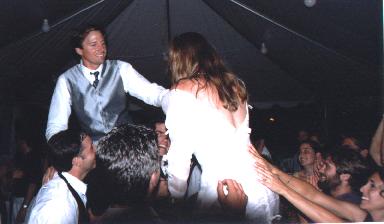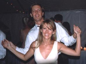 The reception was held pseudo-outdoor in a large and fun tent on what seemed like a summer night's dream. Hans and Tiffany danced the night away with all of the celebrating guests, most of which were partying wildly as if the Clinton-Lewinsky scandal were finally over. |