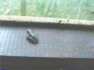 | In our room, we were greeted by a tiny little frog, hanging out on our window sill. He never quite got out ..... and we figure he ended up in froggy heaven. Unfortunately we were also greeted by lots of other bigger uglier jungle insects which Hans heroicly killed so Tiff would not have a heart attack. She still slept under all the covers the first night even though it was sweltering hot. Better hot than eaten by strange jungle "things". At dawn we were able to hear and barely see monkeys playing high up in the trees outside our window. | ![]() |