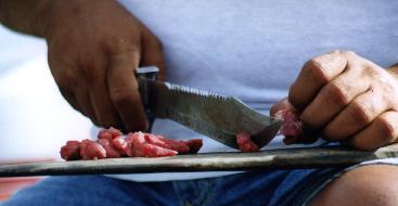 Our guide brought fresh meat to cut for the piranha bait. We put it on the end of a plain old hook attached to a stick and then thrashed it on top of the water. Unlike, other fish which are frightened by noise, Piranhas are attracted to thing struggling in the water. I hate to think of what happens to those who like splashing in the water. |