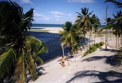That's a fresh water river flowing towards the sea with very large sand dunes on its banks. The place is about 100Km north of Natal and was deserted. It was great fun just floating and playing with the tide as it battled the natural flow of the river towards the ocean. On the other side of the river there was a beautiful pousada with what seemed like hundreds of palm trees and coconuts everywhere. |