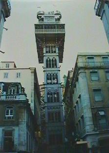 On the right is the elevator that takes people from lower part of town to the uppper part. It costs a couple of cents to travel up an down and saves walking many stairs. At the top there is a little cafe with great views of the city. Lisbon like San Francisco, has many hills that the city is built on. |