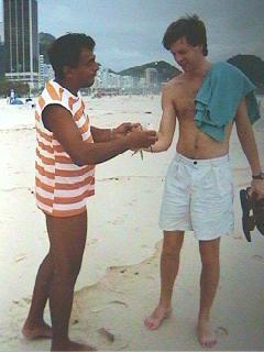 | Hans was getting tired of peace and wanted to begin the search for some knarly windsurf / wave riding action on the ocean, so we headed down to Barra da Tijuca where we found windsurf heaven. However, there's a problem...all this great stuff is *NOT* for rent. It seems that the rich keep their equipment already rigged in a cabana on the beach - price $30/month.- "hey rig boy" included! Hans was begging ..... just one board - please!!! But no-one was lending. It is like being a little kid in the candy shop where you can't touch anything. Boo hoo :( | ![]() |